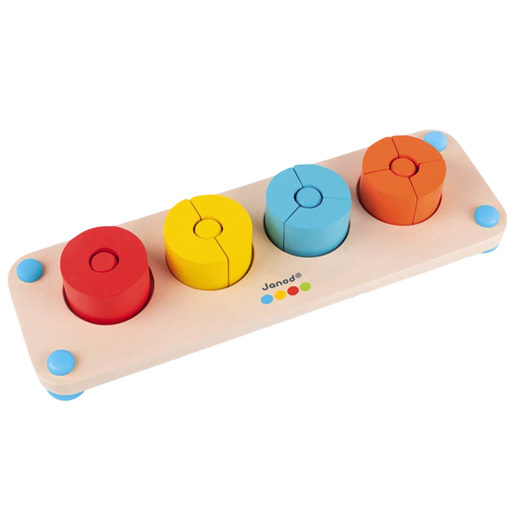 This awakening toy is ideal for familiarizing your child with a simple mathematical concept while having fun: fractions. 1, 2, 3 or 4 pieces are placed on the corresponding colored rod and voila. The tray is equipped with non-slip silicone feet for more stability. This toy will also accompany your child in the discovery of shapes and colors. Water-based paints.