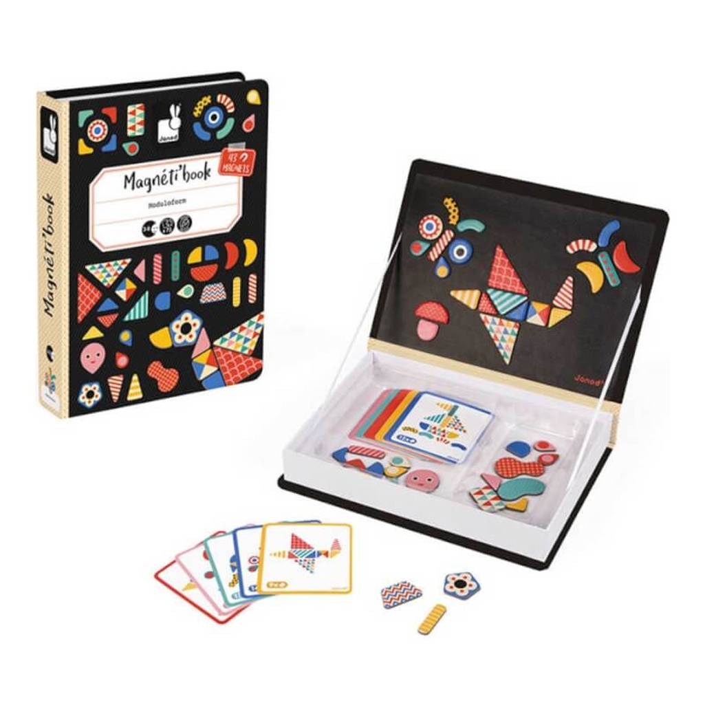 Magnetic educational game in cardboard on the tangram theme. Composed of 43 magnets and 30 cards. Once the “book” is opened, the aim is to make on the stage the same tangram shape as indicated on the card thanks to the magnets.