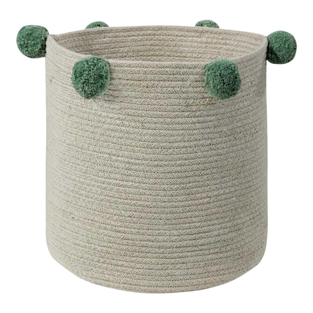 Our Bubbly baskets are very practical to store toys or books, not to mention a very trendy piece for the living room, dining room or any other room of the house. Basket in braided cotton in cotton's original color, decorated with 6 green pompoms. Find all the matching Bubbly blankets in the same colors. Handmade basket.