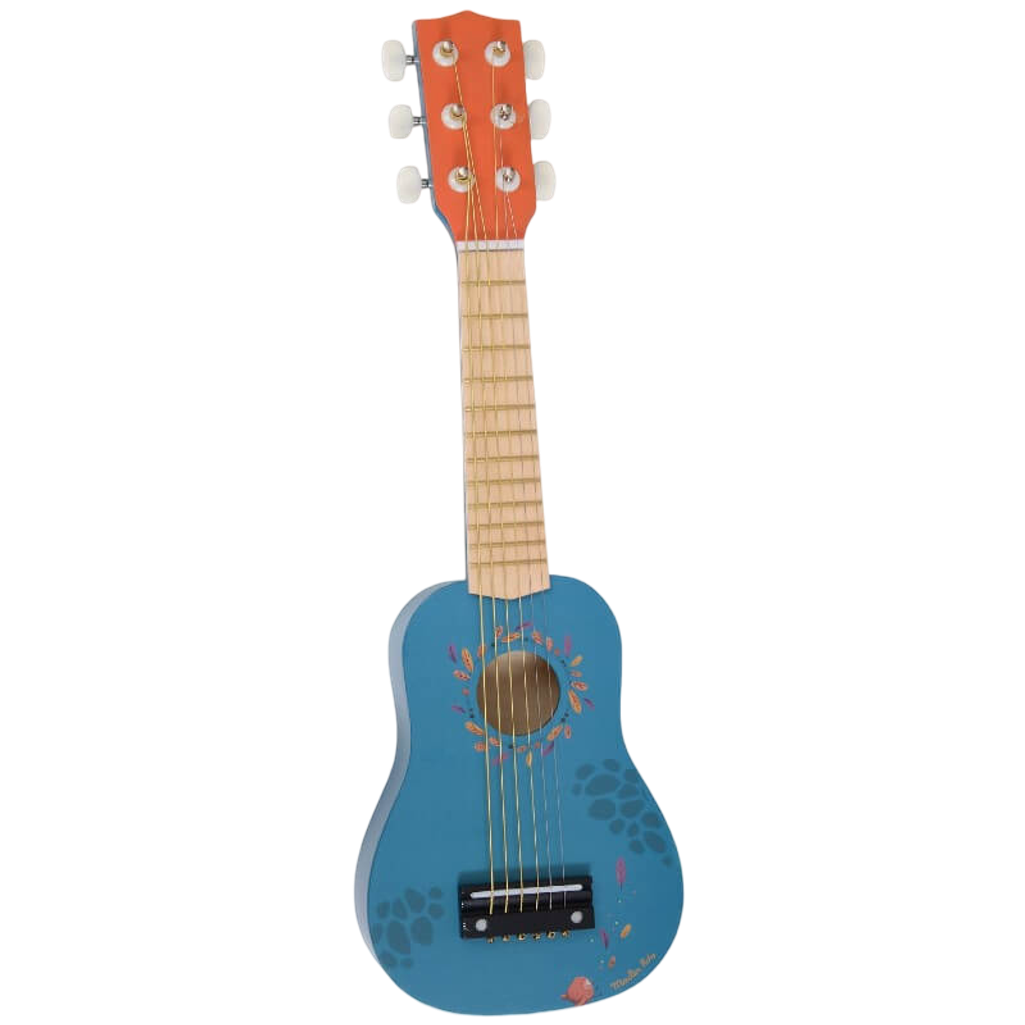 For future musicians, wooden guitar with 6 metal strings. Painted in blue and brick, it is illustrated with a panther motif and flying feathers around the rosette. Develop your child's rhythm, motor skills and musical awakening.