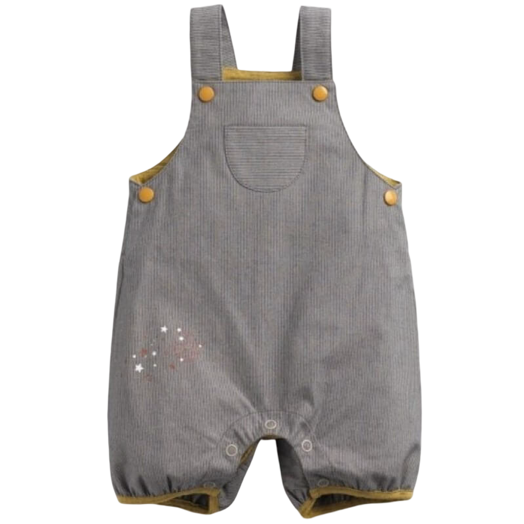 Introducing the Moulin Roty Il Etait Une Fois Tino Striped Dungarees in an elegant grey hue with subtle thin stripes – the epitome of style and comfort for your little one's wardrobe.