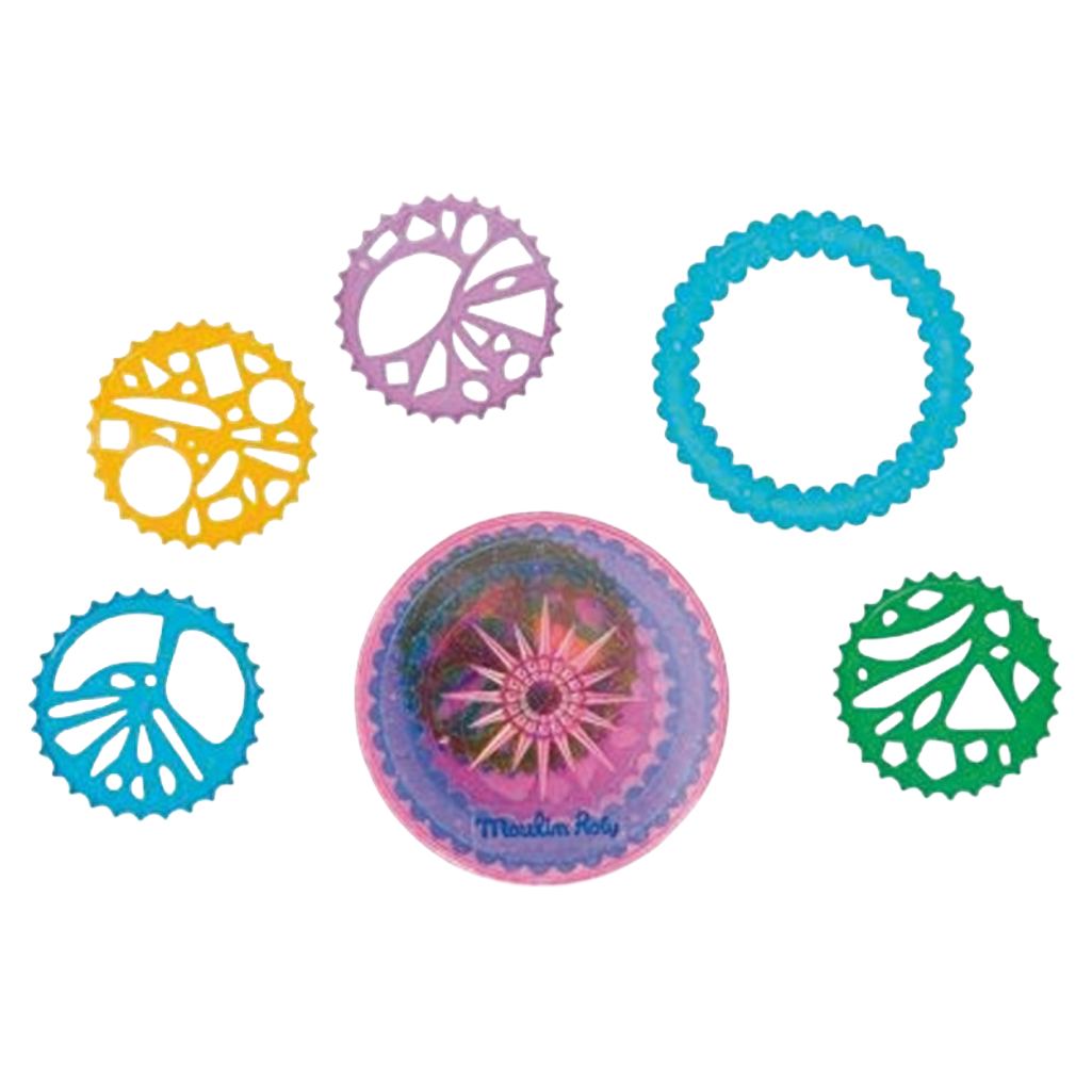 Box containing fives plastic circles in a variety of shapes, sizes and colours to draw all kinds of spirals: fit the smaller plastic circles into the largest circle which is used as a base and slide the pencil round the inside - let the magic begin!