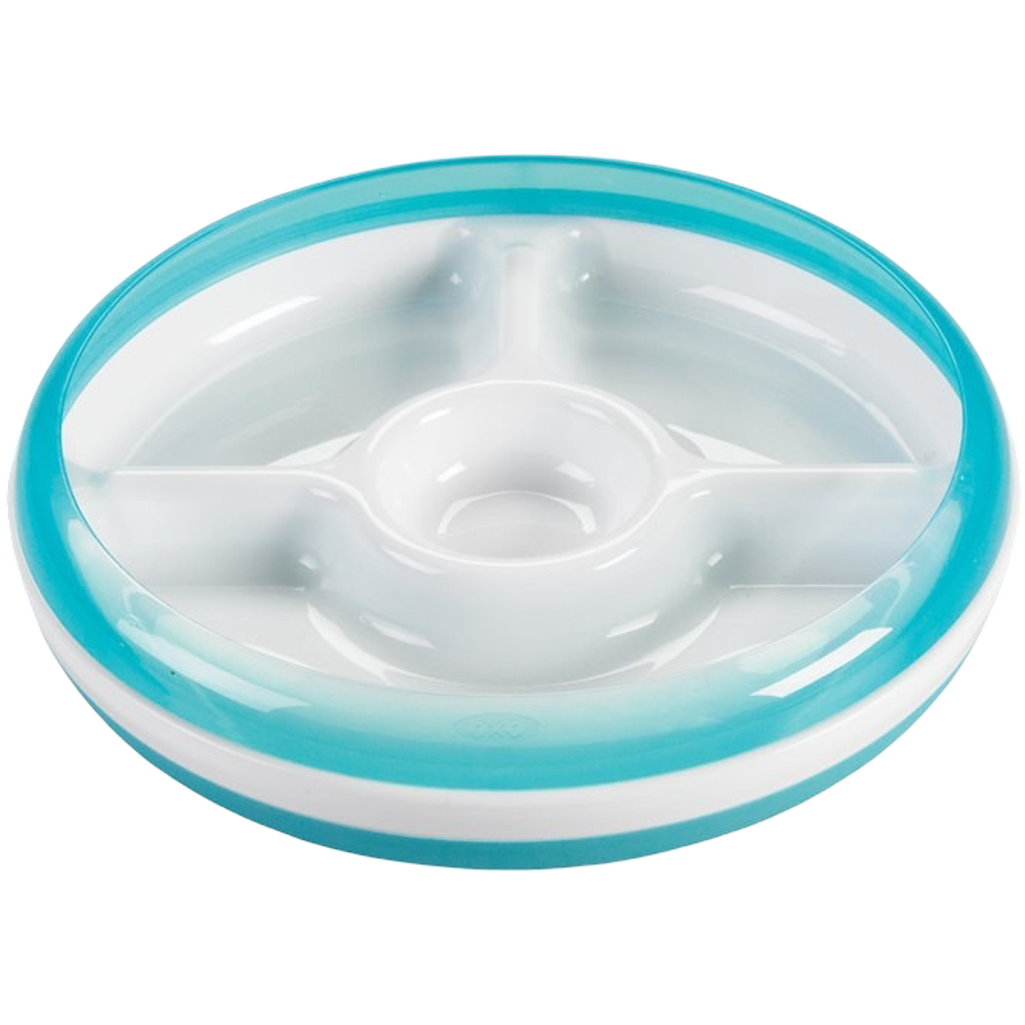 Portions food and keeps it on the plate. Three sections allow for neat eating and balanced portions of protein, veggies and grains, and a center sauce section promotes fun dipping. Features: Removable, raised plate ring when child has mastered self feeding Plate ring helps keep food contained and assists when using utensils Non-slip base Age: 6+ months BPA, Phthalate and PVC free Top rack dishwasher safe and microwave safe Dimensions: 8.5"" x 1.5"" x 11""