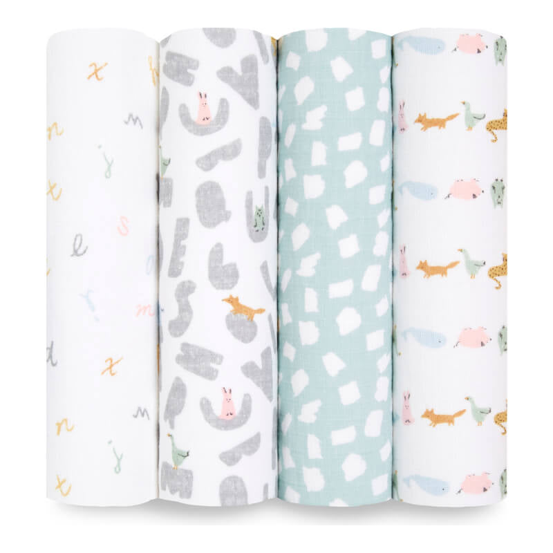 Introducing the aden + anais Essentials Cotton Muslin Swaddles 4-Pack in the charming Alphabet Animals design – your ultimate go-to for baby essentials.