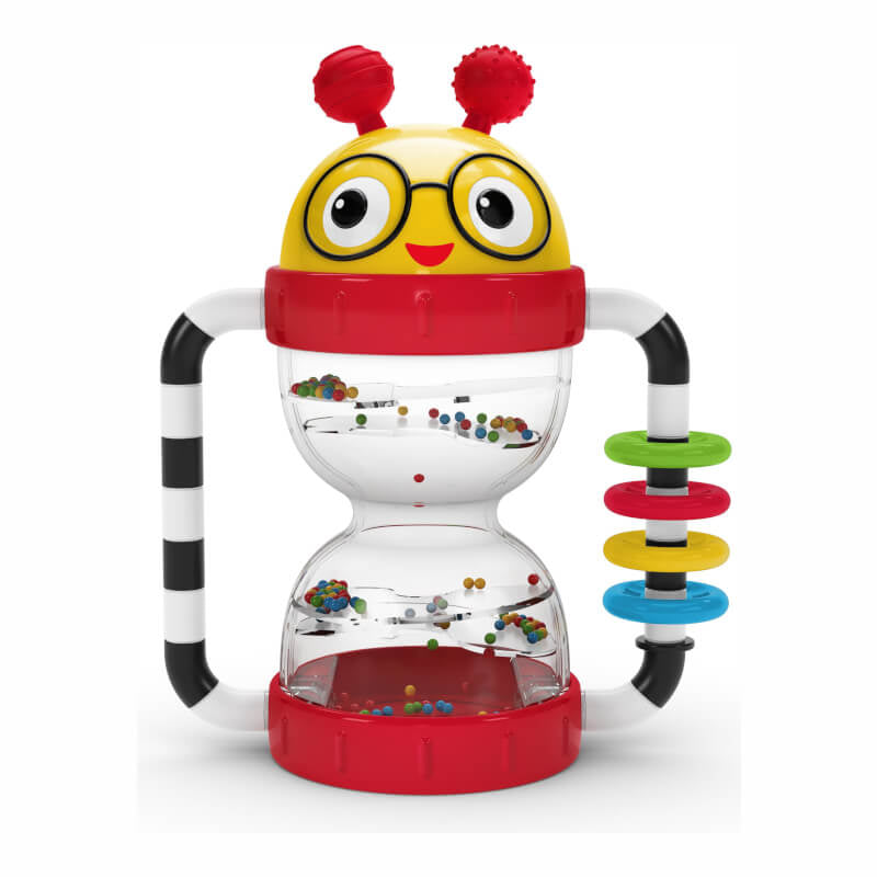 The Baby Einstein Cal’s Sensory Shake-up Activity Rattle is a multi-sensory toy designed to engage baby in sensory play and encourage developmental milestones. 5 sensory features let baby explore new textures, build fine motor skills, and stimulate cause and effect learning with this BPA-free toy. Baby will love to explore the soothing textures of Cal’s antennae or create some noise by shaking the hourglass beads to create rattle sounds. For cause-and-effect discovery, infants can twist Cal’s head to make a clicking sound or use the baby-safe mirror on the toy’s base to promote self-discovery and delight. 4 rattle rings encourage fine motor skills or help parents teach color learning to toddlers. High contrast colors stimulate baby’s visual development, and two easy-to-grasp handles make this battery-free toy a perfect way to engage baby on-the-go.