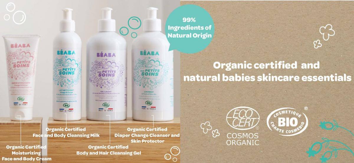 • Natural Nurturing: Immerse your baby in the goodness of nature with Beaba's COSMEBIO® and COSMOS ORGANIC® certified "Aux Petits Soins" range. Our cleansing milk boasts 99% natural ingredients, ensuring a pure and gentle skincare routine from day one.