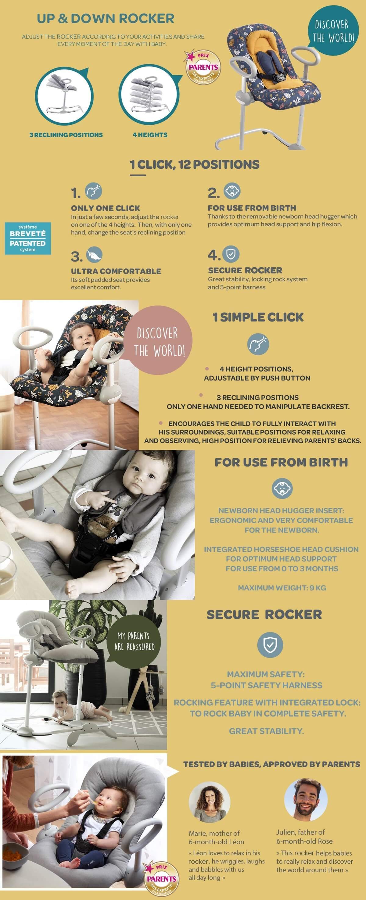 The Up & Down bouncer is also highly secure. It has excellent stability, a rocking lock and 5-point harness, allowing baby to be lulled in complete safety.