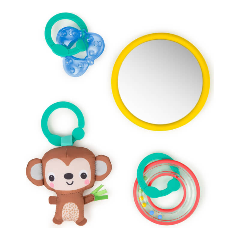 - 4 Detachable Toys: Plush monkey with jingle chimes, tummy time mirror, ring rattle with colorful beads, and soothing texture toy—all on removable FunLinks for customizable play.