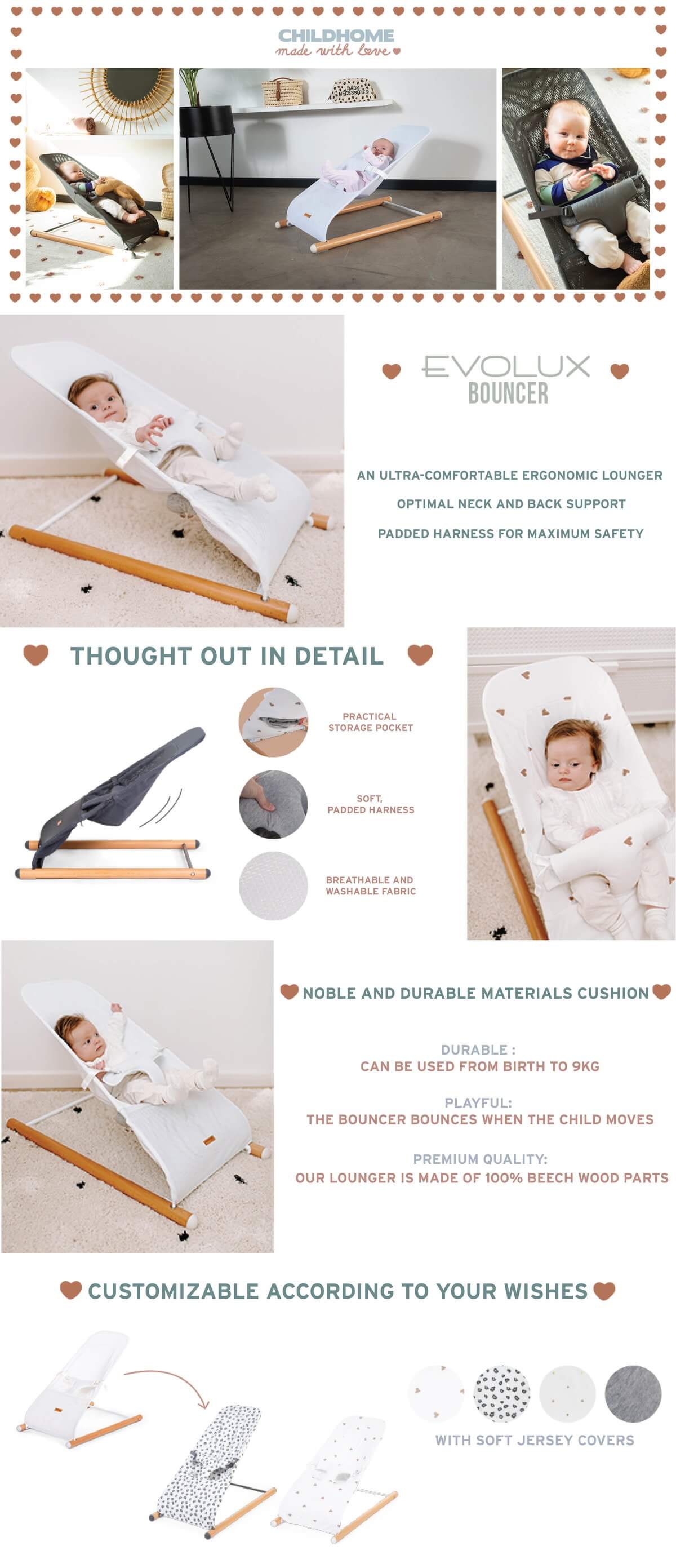 The Evolux bouncer is an ergonomic bouncer with a timeless design that immediately catches the eye. The chair bounces along when the child moves, making it an ideal play and rest spot. The bouncer has one size and one position where simplicity, comfort and design go perfectly together.