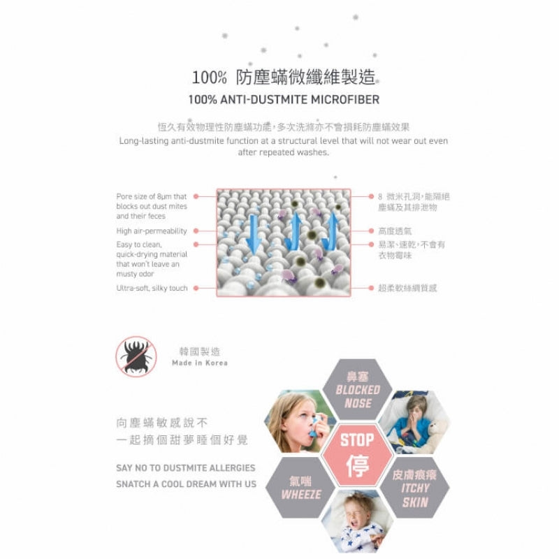 Jadaloo hypoallergenic junior beddings come in a wide range of cheerful prints, suitable for young children.  They are made from microfiber fabric that can effectively root out dustmites and their feces from settling inside the beddings, thereby eliminating the key allergens that cause atopic eczema, rhinitis and asthma.  Moisture from perspiration can be efficiently evaporated, leaving the beddings dry and cozy throughout the night.