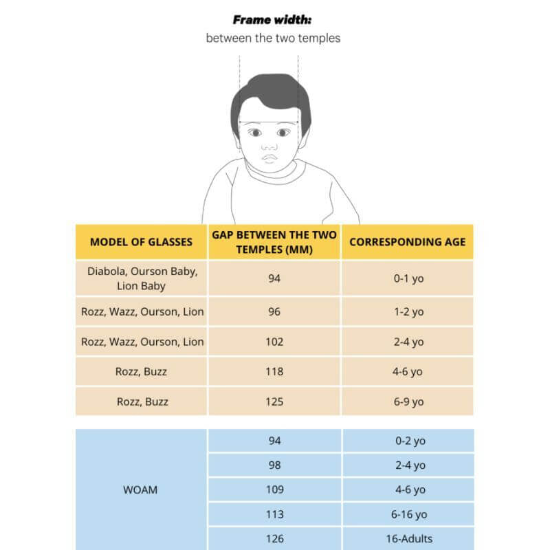 - 3.4 cm-sized (1-2 years old) and 3.6 cm (2-4 years old) lenses for to completely protect children's eyes.