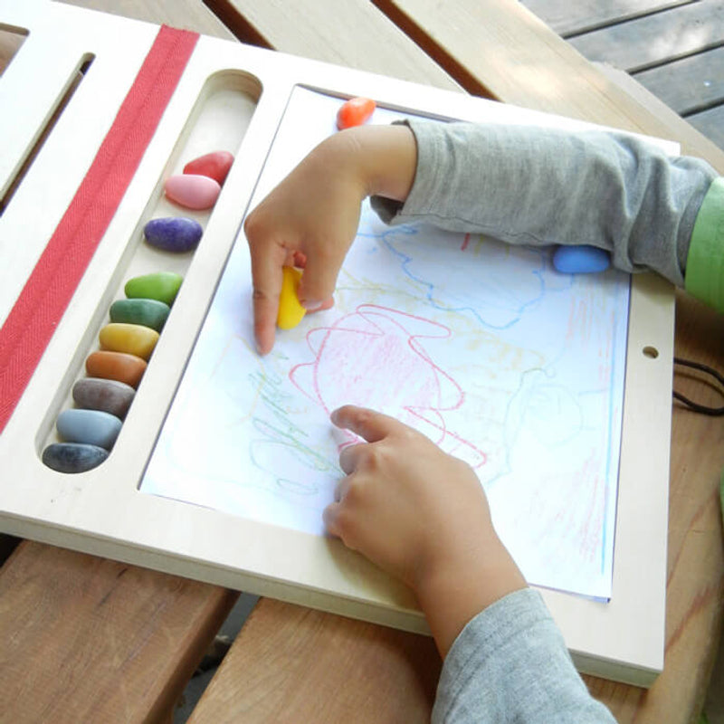 "museo" is a graphic board that encourages children's rich growth, which makes smart & simple time for painting. It is easy to understand the position to store 16 colors of crayon lock (CrayonRock) like stone grass and made it to the top of the drawing board so that it can be put in and out easily with a small child easily. When the colorful crayon opened the board, it brightened the feelings of the child, I chose fun while choosing a crayon so that I could draw a picture. On the paper, 30 sheets of A4 copy paper which is generally easy to obtain are processed so that it can be inserted. After drawing a picture, you can fill the content with a simple function that binds the picture board and hangs the rubber stopper on the button. With this, we will instantly transform from picture boards into picture frames. The picture is framed in a big window in the front, and the color of the crayon used colors colorfully in the slender groove on the top. There is a hook hole which can hang a thumbtack or a nail on the wall and can easily hang the picture board on the top. The opening groove · button · hook chose the material and color so as not to disturb the "picture becoming the leading role". Designed to be "a nice landscape" when drawing and decorating.