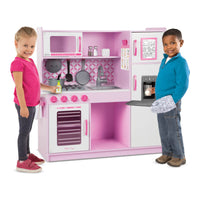 Budding young chefs can hone their craft in this beautifully designed, pretty pink modern play kitchen! The easy to assemble chef's kitchen includes a refrigerator/freezer with working ice maker that dispenses two included "ice cubes," an oven and stovetop with dials that turn, microwave with turning plate, sink with moving faucet and handle, grocery check list, movable hooks, and ample shelving and storage. Detailed, illustrated instructions make this kitchen simple to put together. Assembled, it stands approximately 3.5 feet (1 meter) long and more than three feet (0.9 meters) high. Sturdy, top-quality wooden construction means it will stand up to years of creative make-believe meal-making! Accessories sold separately.