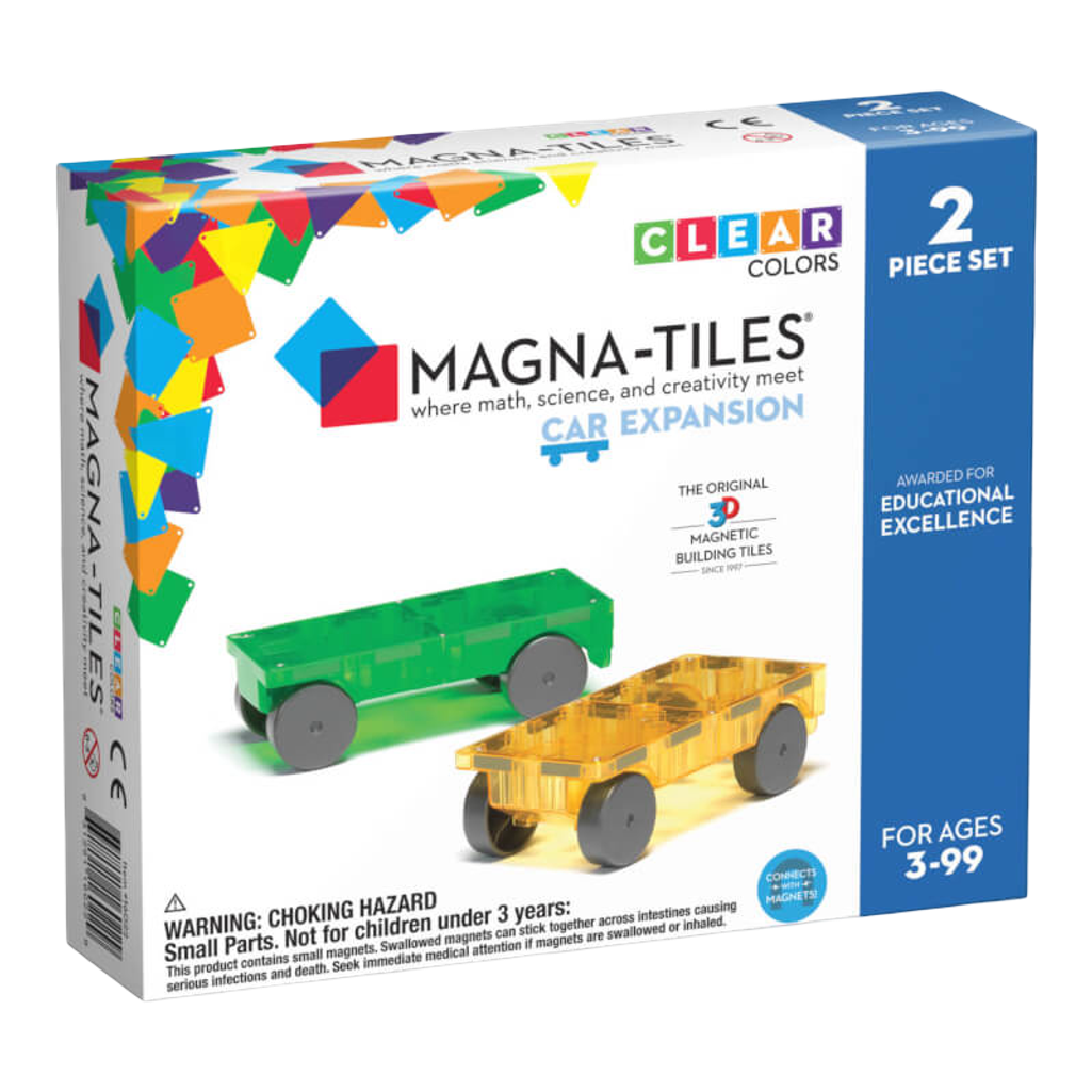 與所有其他 Magna-Tiles® 套裝一樣,Magna-Tiles® Cars 2 件式擴建型積木套裝採用色彩鮮豔、迷人的仿玻璃亮面顏色。