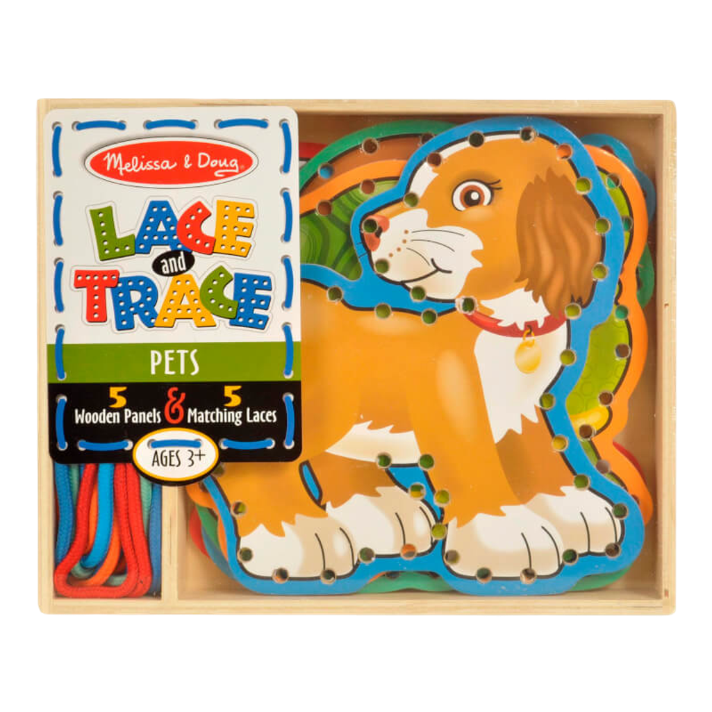 With adorable pets pictured on both sides, it's fun to practice lacing and tracing skills. This wooden set contains five sturdy, double-sided lacing panels, plus five color-coordinated laces! Develop hand-eye coordination and attention skills with this great activity.