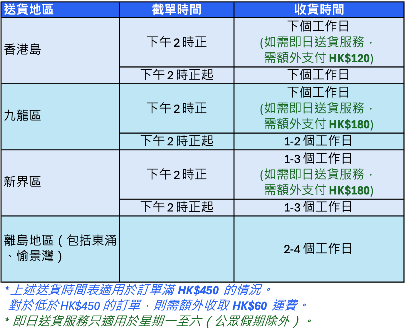 -新界、東湧及愉景灣:+1-4個工作天