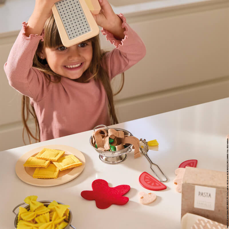 我的天哪!這款義大利麵套裝真是美食家的福音!您家孩子是不是熱愛意麵,喜歡烹飪,而且想像力豐富?他們一定會愛上這款意麵套裝!套裝裡包含了製作美味意麵或法式意麵所需的一切。 3歲以上的孩子可以使用套裝中的各種配件來製作自己的特色菜:20個逼真的蝴蝶麵、4個大餛飩、6片羅勒葉、5個蘑菇和1份番茄醬,全部由毛氈製成。 10根義大利寬麵條則由扁平的絲帶製成,完美地模仿了這種美味意麵的顏色!還有什麼比帕瑪森起司、刨絲器和幾個木製番茄更能讓小廚師們的菜餚更加生動呢?套裝裡還包含湯匙、濾網和金屬鍋,方便盛放在盤子裡。更實用的是,所有義面都收納在兩個漂亮的紙盒裡!這款模擬玩具非常適合搭配烹飪遊戲或過家家遊戲使用。它能激發孩子的想像力,並促進與親朋好友的分享。裝飾塗料為水性塗料。
